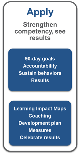 Applying what one has learned is where 80-90% of learning takes place. The Application phase involves using the skills and knowledge within the work environment. This phase is what makes the learning “stick,” causing a behavior change that produces desired results. During this phase, the Learning Impact Maps are used to reflect on the original goals and note any new-found knowledge, and a subject matter expert coach is available to support and expand the depth of the application.